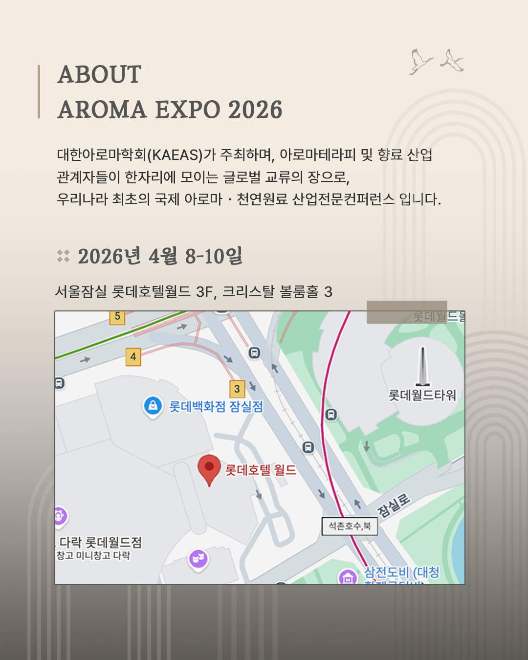 오는 4월, 서울 롯데호텔월드에서 Aroma Expo 2026가 한국 최초로 개최됩니다.아로마테라피, 천연 원료, 향료 및 웰니스 산업을 아우르는 이번 전시는전 세계 전문가와 기업들이 모여 최신 트렌드와 비즈니스 기회를 공유하는 자리인데요 ✨